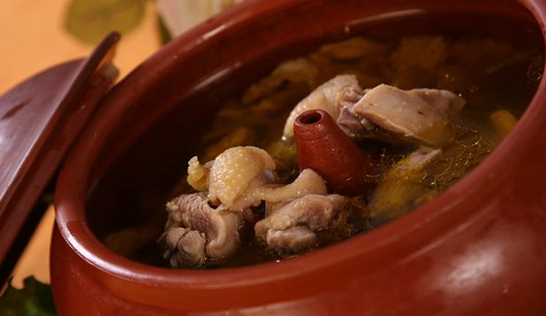 汽锅鸡是云南独有的高级风味菜,它的烹制方法特殊,鸡肉细嫩、汤汁鲜美、原汁原味、富于营养,在国内外均享盛誉。在烹饪时,在汽锅下放一盛满水的汤锅,然后把鸡块放入汽锅内,纯由蒸汽将鸡蒸熟,此菜汤汁为蒸汽凝成,保持了原汗原味,肉嫩香,汤清鲜,深得食者赞誉。