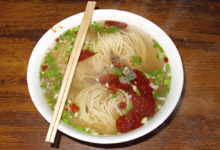 兰州拉面创始于光绪年间,系回族老人马保子首创。牛肉面以肉烂汤鲜、面质精细而蜚声中外。兰州牛肉面有一清(汤清)、二白(萝卜白)、三红(辣子油红)、四绿(香菜绿)、五黄(面条黄亮)五大特点。面条根据粗细可分为大宽、宽、细、二细、毛细、韭叶子等种类。面条用手工现场拉成,一碗面不到两分钟即可做好,再浇上调好的牛肉面汤、白萝卜片,调上红红的辣椒油、碧绿的蒜苗、香菜,食之令人叫绝。