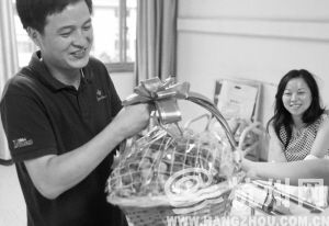 吴菊萍丈夫从记者手中接过快报送的水果篮