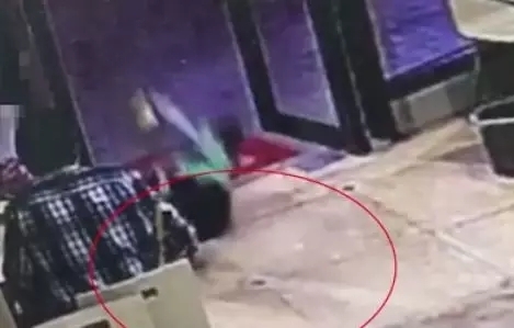 就在一分钟之后,令人瞠目结舌的一幕发生了:当男童跑过女子桌边时,女子竟突然伸出左脚,将男童绊倒在地。