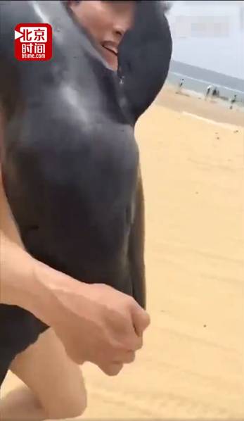 游客疑似活捉海豚 肩扛走海豚男子将会被处罚