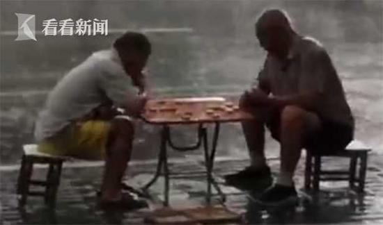 俩大爷暴雨中下棋 非常淡定 不分胜负 绝不撤离