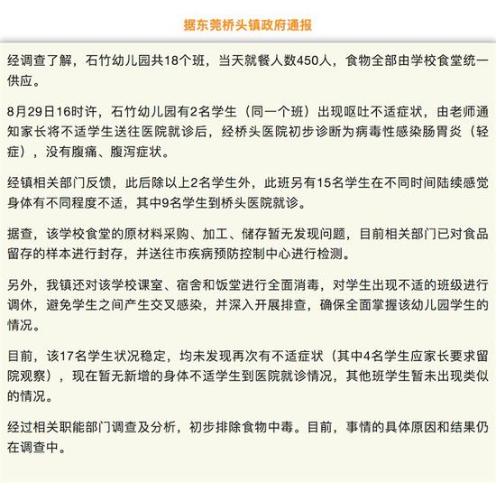 经调查了解,石竹幼儿园共18个班,当天就餐人数450人,食物全部由学校食堂统一供应。 8月29日16时许,石竹幼儿园有2名学生(同一个班)出现呕吐不适症状,由老师通知家长将不适学生送往医院就诊后,经桥头医院初步诊断为病毒性感染肠胃炎(轻症),没有腹痛、腹泻症状。 经镇相关部门反馈,此后除以上2名学生外,此班另有15名学生在不同时间陆续感觉身体有不同程度不适,其中9名学生到桥头医院就诊。 据查,该学校食堂的原材料采购、加工、储存暂无发现问题,目前相关部门已对食品留存的样本进行封存,并送往市疾病预防控制中心进行检测。 另外,我镇还对该学校课室、宿舍和饭堂进行全面消毒,对学生出现不适的班级进行调休,避免学生之间产生交叉感染,并深入开展排查,确保全面掌握该幼儿园学生的情况。