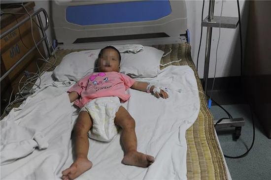 小娇被火速送入石头镇卫生院,随即转入容县第一人民医院。容县人民医院儿科一区的值班医生刘静芳介绍,“中午接到孩子的时候,孩子是处于昏迷状态,全身皮肤挫伤,脱水非常严重。”
