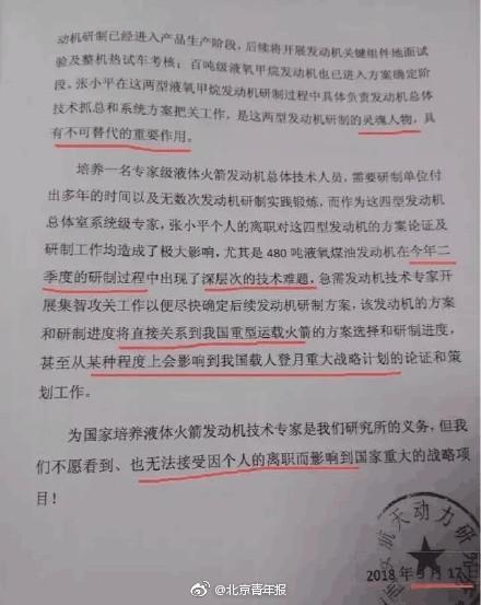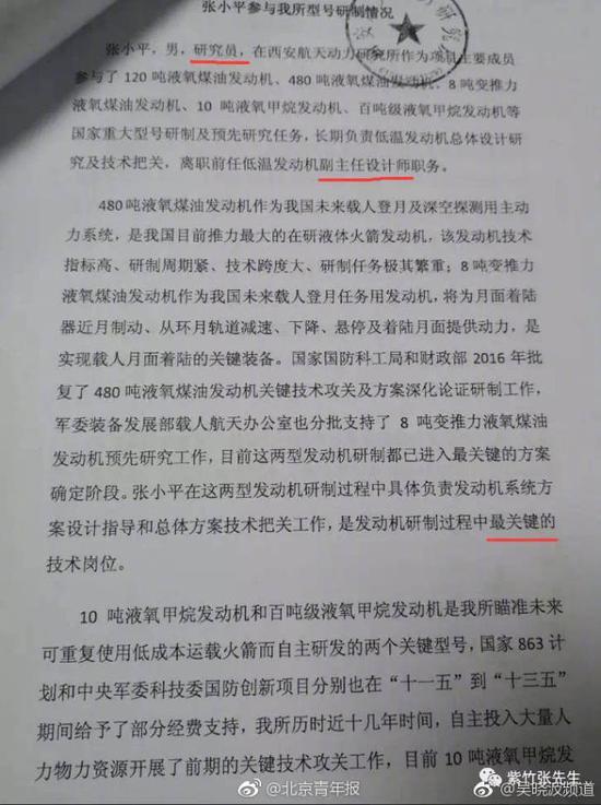 近日,微博公号中一篇《离职能直接影 响中国登月的人才,只配待在国企底层?》的文章引发网友关注,文章中贴出了一份“张小平参与我所型号研制情况”的材 料的照片,在这份照片上,还盖有张小平原来所在单位的公章。