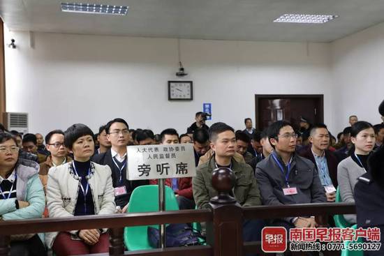 ▲旁听席 除此之外,公诉机关还指出,在2017年初至2018年6月期间,吴冬林还分别允许李某某经营具有赌博性质的游戏机,以及莫某某经营从事组织卖淫的按摩保健场所,并分别收受了两人的“好处费”80万元和48万元。 2018年7月11日,玉林市监察委员会依法对吴冬林采取留置措施,对其住所、车辆、办公地点进行搜查,扣押现金354万余元。其中,132万元为其受贿所得,另有209万元吴冬林无法说明来源。 在最后陈述环节,2名被告当庭表示认罪、悔罪。