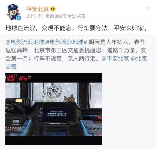 @平安北京 转发并评论原博说:“地球在流浪,交规不能忘;行车要守法,平安来归家。”