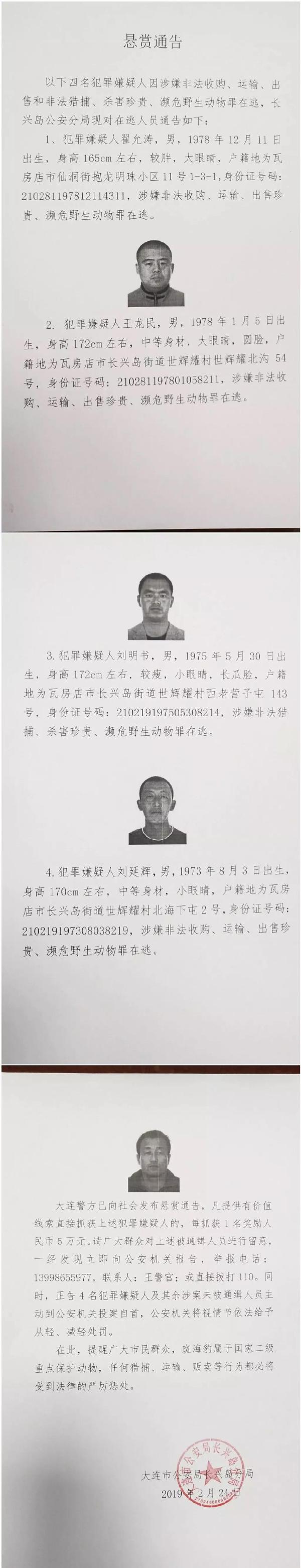 大连市公安局长兴岛分局官方微博消息,警方向社会发布悬赏通告,正告4名犯罪嫌疑人及其余涉案未被通缉人员主动到公安机关投案自首。