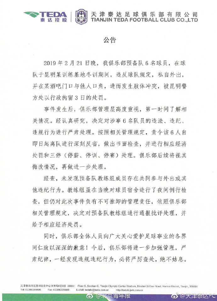 天津泰达足球俱乐部有限公司官方微博24日通报称,2019年2月21日晚,天津泰达俱乐部预备队6名球员,在球队于昆明某训练基地冬训期间,违反球队规定,私自外出,并在某酒吧门口与他人口角,进而发生肢体冲突,被昆明警方处以行政拘留3日的处罚。