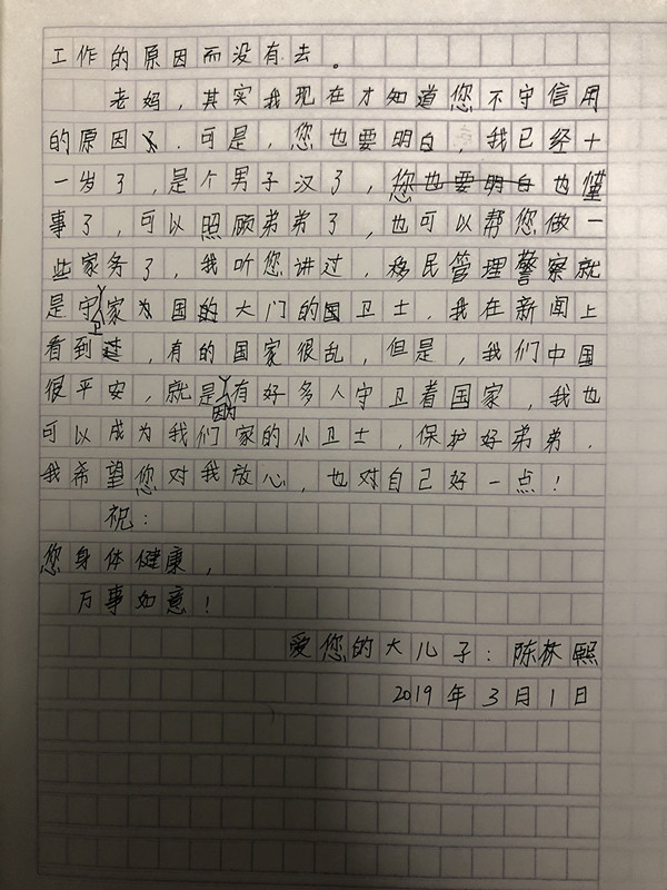 信件原文如下: 亲爱的老妈: 您好!我爱您!您的爱如绵绵的春雨,滋润着我的心田;您的爱如一缕阳光,让我即使在寒冷的冬天里也能感受到温暖;您是世界上最好的妈妈。可是您有一个缺点总是在我心里跑来跑去,就是您爱撒谎。您教育我要做一个诚实守信的人,可是您自己却没有做到。 外公很多次从潮汕老家来到广州看望我们,他都会问您工作忙不忙,累不累。您总是说不忙、不累。我知道其实您是不想让外公担心,但是您的确很累,工作也很忙。上早班的时候,天还没亮您已经到达工作室,上完晚班回到家的时候,我和弟弟已经进入甜蜜的梦中了。有时候您回到家,累得倒在沙发上就睡着了,我还悄悄给您盖被子呢! 记得端午节的时候,才一岁的弟弟半夜发烧了,但是您一如往常一样,天还没亮就去上班了,生病的弟弟娇气又闹腾,一直在哭闹,水也不喝,药喂进去就吐出来,爸爸束手无策,怎么哄都不行。弟弟哭累了就睡着了,过一会又继续哭,哭得嗓子都哑了,我看了很心疼,就偷偷给您打了个电话,您告诉我处理完手上这件事情就回家,可是您又不守信用了,我们等到午后您才回家。您看着弟弟无精打采,哭到肝肠寸断的样子很心疼,马上给弟弟喂药,喂奶,弟弟终于在您的怀里睡着了。我以为您会陪着弟弟,结果,您把弟弟放在小床上,又去上班了。 在一个周末,您终于可以休息了,带着我和弟弟去公园,我们已经约定您不能看手机专心陪我们玩,可是刚玩了一会,您手机铃声就响了,就把弟弟交给我们了,说有一位老师要带一百多位学生去香港交流,向您咨询过关的问题,您忙着回复,又不守信用了。还有好多次我参加足球比赛,您答应我当观众的,可是最后您都因为工作的原因没有去。 老妈,其实我知道您不守信用的原因,可是您也要明白,我已经十一岁了,是个男子汉了,也懂事了,可以照顾弟弟,也可以帮您做一些家务了。我听您说过,移民管理警察就是守卫国家大门的卫士。我在新闻上看到,有的国家很乱,但是我们中国很平安,就是因为有好多人守卫着国家。我也可以成为我们家的小卫士,保护好弟弟,我希望您对我放心,也对自己好一点! 祝: 身体健康 万事如意 您的大儿子 陈林熙 2019年3月1日 “我也可以成为我们家的小卫士,保护好弟弟,我希望您对我放心,也对自己好一点!”让林婵巧意外的是,这封开头扎心的信,结尾竟然如此温暖。原来,她善意的谎言孩子早已识破。