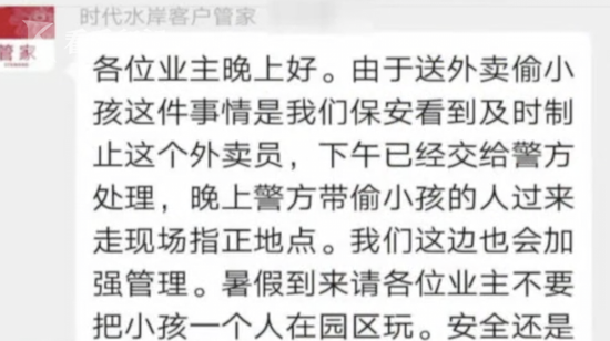经业主们一致确认,女孩是小区里的住户,抱走女孩的人是一名外卖员,并非该栋楼的住户,而且他与小女孩应该互不相识。 7月14日,小区物业管理处就此事发布了通报,通报中指出,晚上,警方带该名“偷小孩的人”回到小区,指认现场。 不过,到了15日,物业工作人员却改口说:这一切都是误会一场,外卖员并不是人贩子,只是想和女孩玩耍,女孩也没有因此受伤。