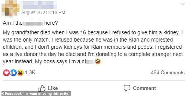 这名女子在脸书上爆料自己的往事说,"我梦见自己是一个小气鬼。在我十几岁的时候,我的祖父需要一个肾脏。当我发现只有我能提供给他的时候,我拒绝了他。因为他曾猥亵儿童,并是3k党的一员。"