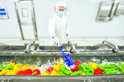 在新发地四季顺鑫净菜加工车间,工人运用机械化设备清洗彩椒。