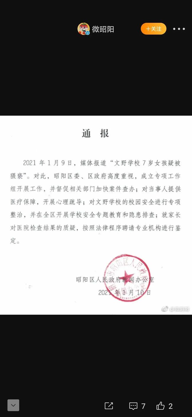 不过,就在1月10日下午,昭阳区人民政府新闻办公室发布通报,称2021年1月9日,媒体报道“文野学校7岁女孩疑被猥亵”。对此,昭阳区委、区政府高度重视,成立专项工作组开展工作,并督促有关部门加快案件查办;对当事人提供医疗保障,开展心理疏导;对文野学校的校园安全进行专项整治,并在全区开展学校安全专题教育和隐患排查;就家长对医院检查结果的质疑,按照法律程序聘请专业机构进行鉴定。