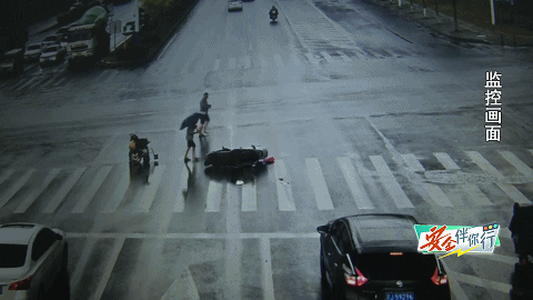 ▲紧急刹车避让后,摩托车没有撞上行人,但驾驶员却倒地不起,而两名闯红灯的行人也没上前查看驾驶员的伤情,就直接离开了。
