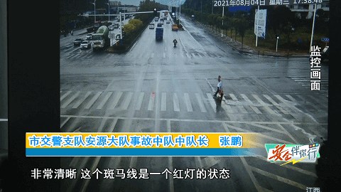 张鹏市交警支队安源大队事故中队中队长:这是行人过斑马线,当时是一个红灯的状态,二轮摩托车在避让行人的时候,自己制动不当的情况下,摔倒了。