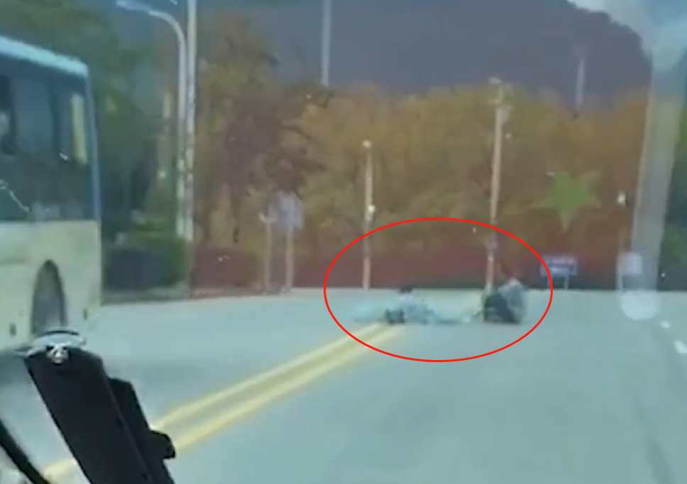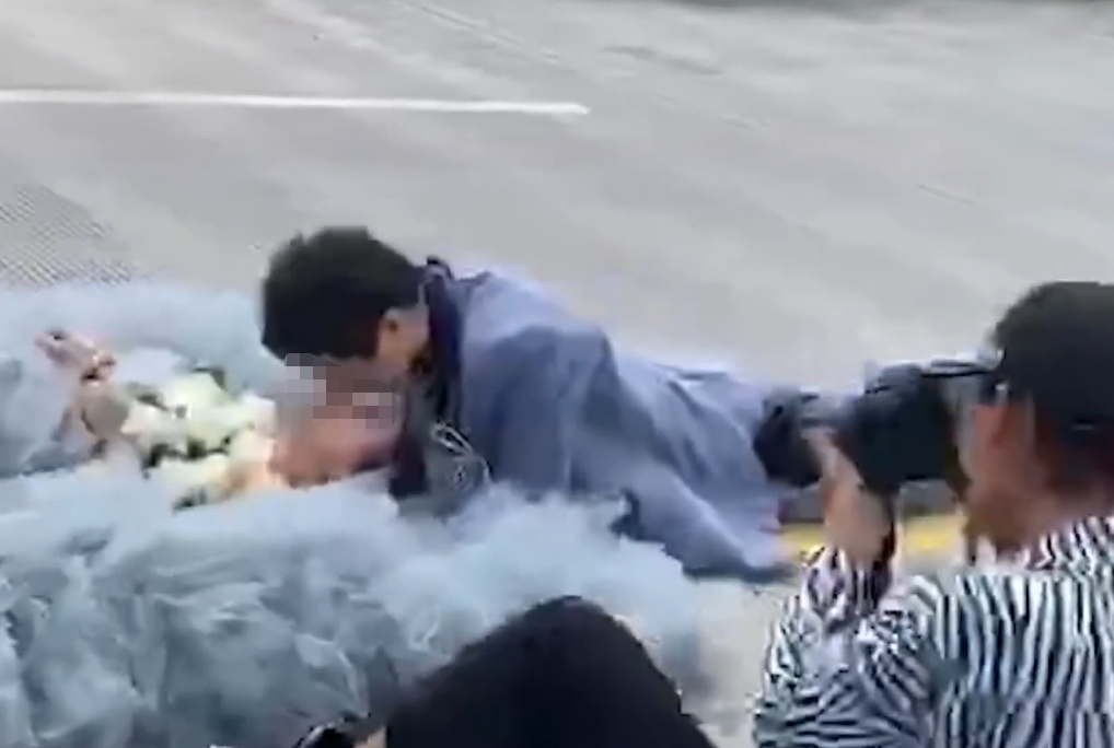 在一段视频中,拍婚纱的两人直接躺在道路中间,摄影师也坐在旁边拍摄,完全不顾及一旁的交通安全警示牌的警示提醒,以及过往的车辆和自身安全。