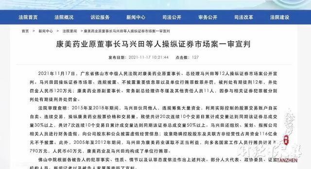 马兴田因操纵证券市场罪、违规披露、不披露重要信息罪以及单位行贿罪数罪并罚,被判处有期徒刑12年,并处罚金人民币120万元;康美药业原副董事长、常务副总经理许冬瑾及其他责任人员11人,因参与相关证券犯罪被分别判处有期徒刑并处罚金。