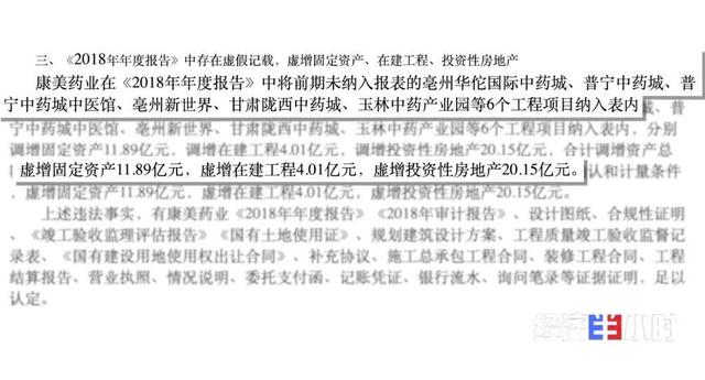 证监会2020年5月14日对康美药业下达《行政处罚决定书》,查证康美药业在《2018年年度报告》中以亳州华佗国际中药城、普宁中药城等6个工程项目为理由,虚增固定资产11.89亿元,虚增在建工程4.01亿元,虚增投资性房地产20.15亿元。