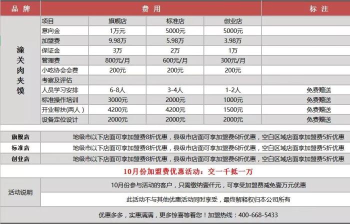 申请商标后,“潼关肉夹馍”就开放了品牌授权和加盟体系。该协会发布的加盟费用表显示,加盟潼关肉夹馍旗舰店、标准店和创业店的费用分别为9.98万元、5.98万元、3.98万元,加上各类杂费,上述三类店铺的加盟总费用约为14万元、9万元、5万元。