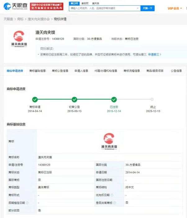 天眼查信息显示,“潼关肉夹馍协会”成功注册的仅有方便食品类“潼关肉夹馍”一枚商标,申请日期为2014年4月,专用权期限至2025年12月。