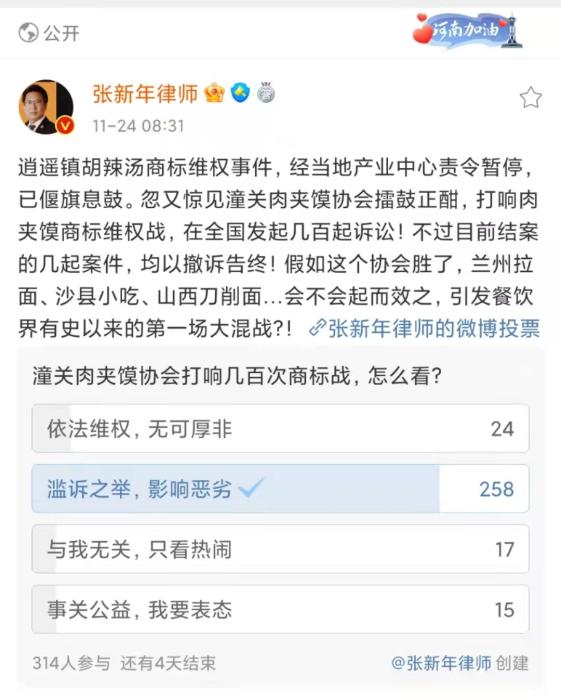 北京中闻律师事务所律师张新年表示:“逍遥镇胡辣汤商标维权事件,经当地产业中心责令暂停。潼关肉夹馍协会又打响商标维权战,在全国发起几百起诉讼,假如这个协会胜了,兰州拉面、沙县小吃、山西刀削面…会不会起而效之?”