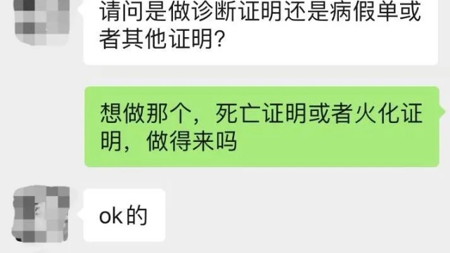 记者随机联系了其中9家店铺,询问客服是否能开“死亡证明”,有2家店铺明确表示做不了,另有7家表示可以办理相关“证明”。有客服隐晦地表示“想要的证明我们这里都有”,并发来微信号,暗示让记者添加微信“私聊”。