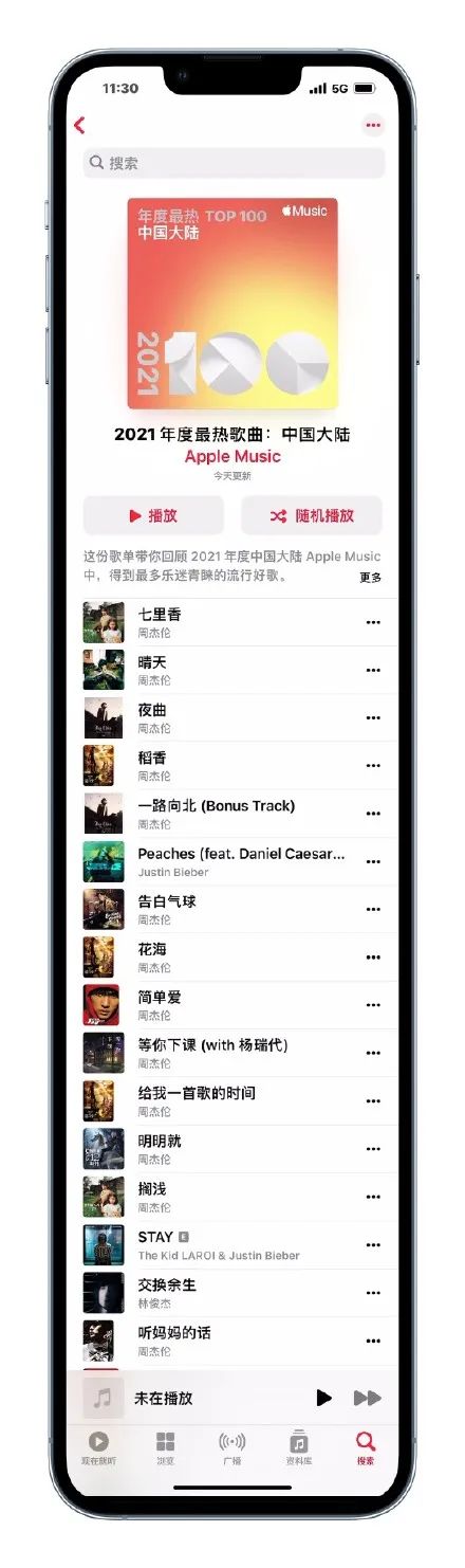 前不久,Apple Music出炉2021年国区年度歌单TOP 100,周杰伦又霸榜了:排在前10名有9首都是周杰伦的歌曲,整个歌单100首歌曲里周杰伦有54首入选。
