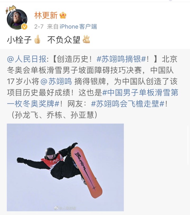 2月7日,苏翊鸣夺得单板滑雪坡面障碍技巧亚军后,《智取威虎山》的“少剑波”林更新就在微博上竖起大拇指:“小栓子,不负众望”,“小白鸽”佟丽娅也在微博上激动地写道:“小栓子太厉害了,真棒!”