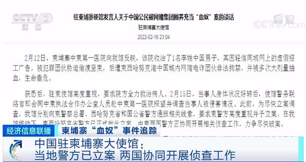 中柬商业协会常务副主席 陈岸:2月11日傍晚时分,我们接到了求助者,我们把他送到了医院。经过医生的检查,证实了他的说法,确实是被多次抽血,血管内已经很难抽到血了。当天晚上第一时间就给他供血了,也有志愿者和热心人士想来献血。目前,他在大家的关心和支持下,神志清醒、晚上也能睡着觉了,正在逐步康复,但是造血功能还有一些障碍,所以还要继续输血。