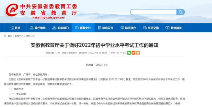 3月8日下午,《安徽省教育厅关于做好2022年初中学业水平考试工作的通知》正式发布,此次“中考方案”中明确:文化课考试全省统一命题、统一制卷。6月14日开始考试。