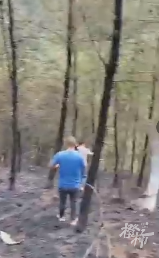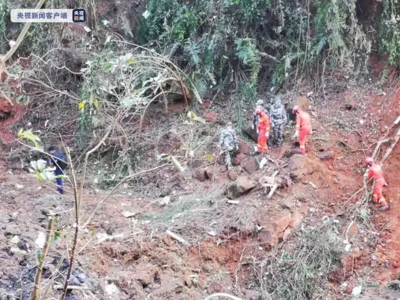 视频显示:坠机现场四周均为山林,周围植被有烧焦痕迹。画面可见有救援车辆,救援人员在地面活动。