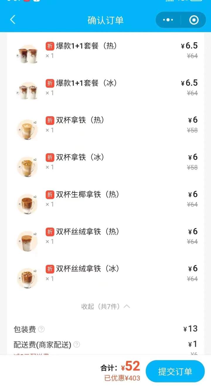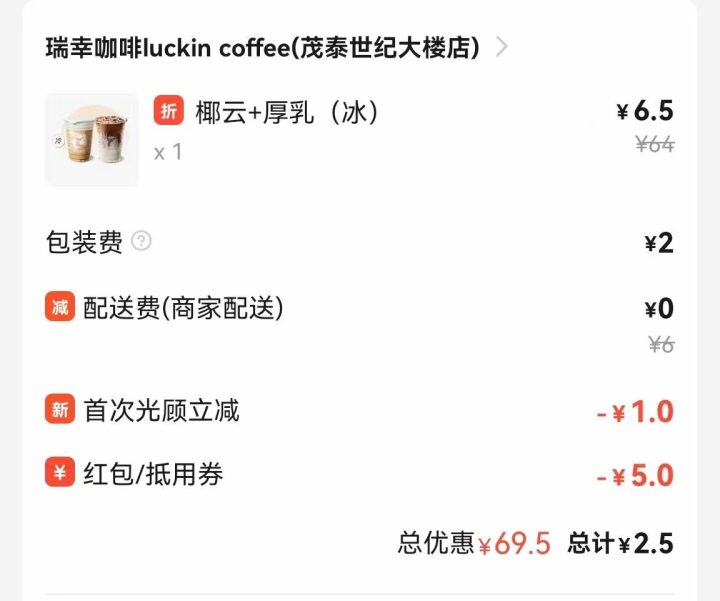 很多网友表示,瑞幸饿了么门店椰云系列双杯套餐打0.94折,双杯生椰拿铁、丝绒拿铁等产品,用户下单有大幅优惠,有人2块钱就能下单一个“冰椰云拿铁大福套餐”,多数原价64块钱的单杯咖啡,现售价只有6块钱。