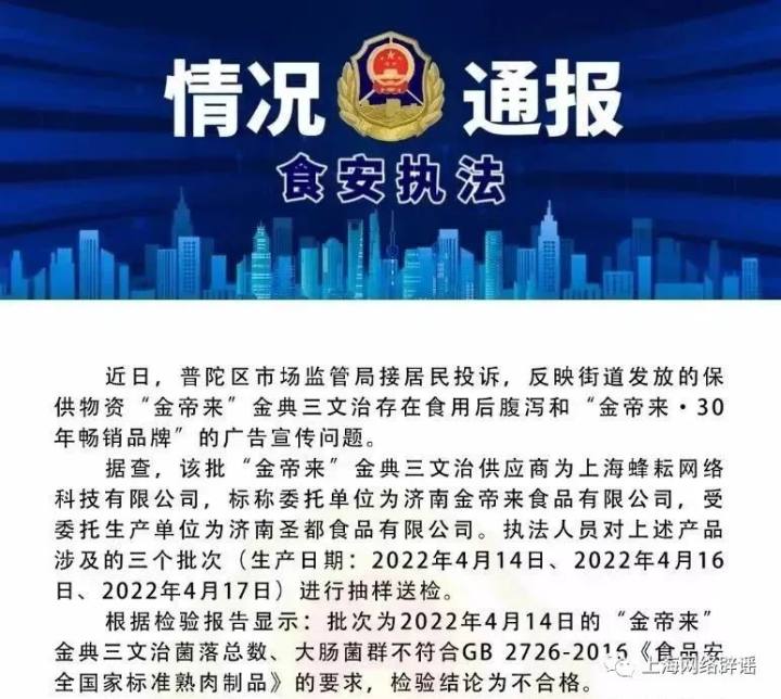 上海网络辟谣消息 前段时间,上海长寿路街道有居民食用街道发放的“金帝来”金典三文治后出现腹泻情况。5月8日,上海市市场监管局通报相关调查情况表示,该产品抽检不合格,菌落总数、大肠菌群超标。供应商已被立案调查。