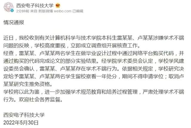记者发稿前,西安电子科技大学官方微博发布情况通报:近日,学校收到有关计算机科学与技术学院本科生雷某某、卢某某涉嫌学术不端问题的反映,学校高度重视,立即成立调查组开展核查工作。