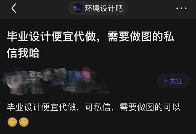 虽然目前几大电商平台、论坛等均已杜绝了“毕业设计代做”等相关搜索,但隐蔽的“代做”生意尚存,手段越发难寻。学生和商家还是会用“代做设计”“制作美化”等词汇规避风险。同时,在贴吧、学生群中,经常会出现一些诸如“毕业设计便宜代做,可私信”之类的广告。一些学生还会发帖寻找专业代做人士,底下基本都有愿意接单的人留言跟帖。