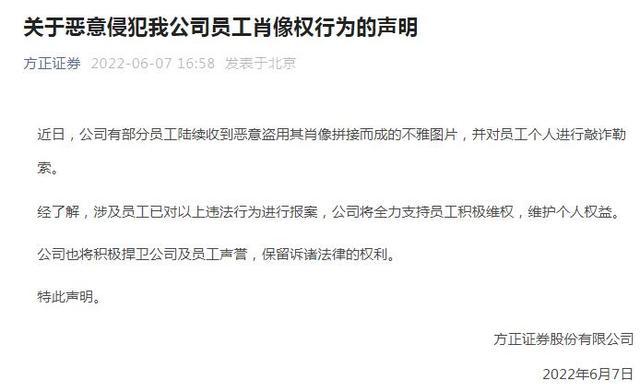 声明称,经了解,涉及员工已对以上违法行为进行报案,方正证券将全力支持员工积极维权,维护个人权益。公司也将积极捍卫公司及员工声誉,保留诉诸法律的权利。