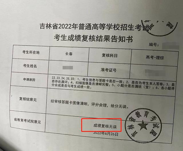 另据媒体报道,当地区、市、省三级教育部门表示,吉林省考试院出具的复核结果就是最终结果,“历年都没有再次复核的情况。”该工作人员还介绍称,高考批卷、核分都有一套严格的流程,不可能出现遗漏,而且成绩复核工作已经结束。