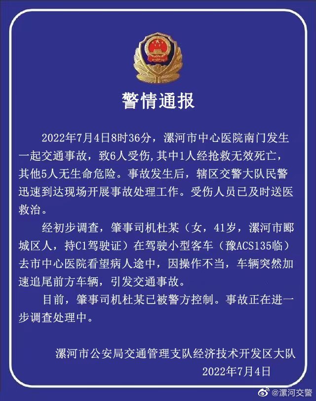 据漯河市公安局交通管理支队经济技术开发区大队通报,2022年7月4日8时36分,漯河市中心医院南门发生一起交通事故,致6人受伤,其中1人经抢救无效死亡,其他5人无生命危险。事故发生后,辖区交警大队民警迅速到达现场开展事故处理工作。受伤人员已及时送医救治。