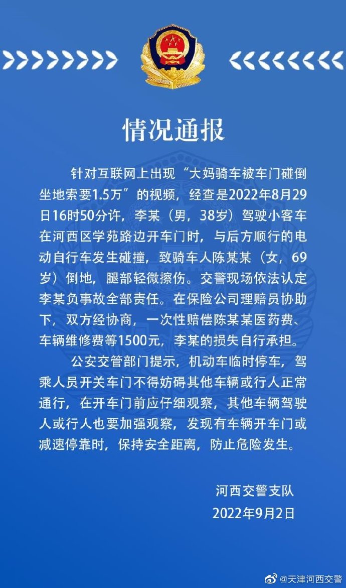 中新网9月2日电 天津市公安交通管理局河西支队2日在其官方微博发布通报称,针对互联网上出现“大妈骑车被车门碰倒坐地索要1.5万”的视频,经查是8月29日16时50分许,李某(男,38岁)驾驶小客车在河西区学苑路边开车门时,与后方顺行的电动自行车发生碰撞,致骑车人陈某某(女,69岁)倒地,腿部轻微擦伤。交警现场依法认定李某负事故全部责任。在保险公司理赔员协助下,双方经协商,一次性赔偿陈某某医药费车辆维修费等1500元,李某的损失自行承担。