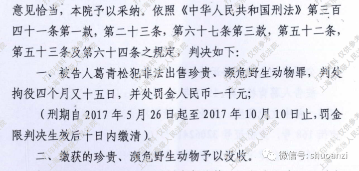 同年9月22日,上海铁路运输法院作出一审判决:葛青松犯非法出售珍贵、濒危野生动物罪,判处拘役四个月又十五日,并处罚金一千元,缴获的珍贵、濒危野生动物予以没收。