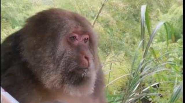 小猴自己出来找食,住在寺院的叶奶奶看到了,会喂它吃点水果等。叶奶奶说,刚开始,小猴是怕她的,后来她常常给它喂吃的,小猴就跟她熟悉起来了,经常来找叶奶奶。