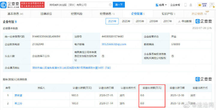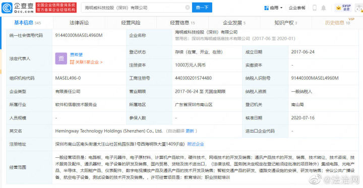 企查查显示,该公司成立于2017年6月24日,注册资本1000万人民币,经营范围包含集成电路、光电产品、半导体、太阳能产品、仪表配件、数字电视播放产品及通讯产品的技术开发及销售;智能交通产品的研发、道路交通设施的安装、研发与销售等。据该公司已公示年报显示,该公司实缴资本为0。