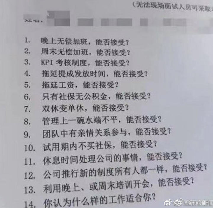 面试问题包括是否接受晚上无偿加班、周末无偿加班、拖延提成发放、拖延工资、双休变单休、休息时间处理公事、晚上或周末培训开会、试用期不买社保等令应聘者非常敏感的问题。