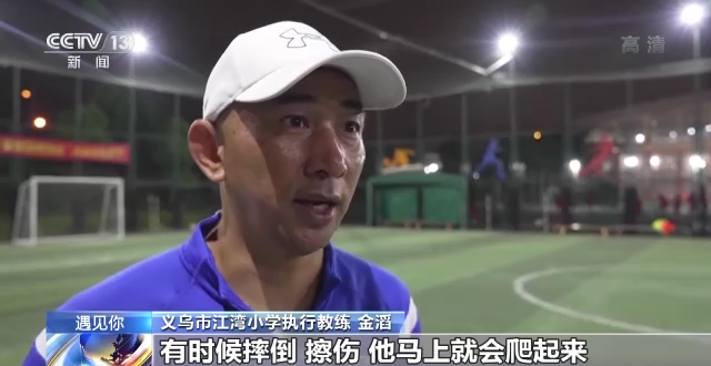 义乌市江湾小学执行教练 金滔:平时训练也很刻苦,风雨无阻,有时候摔倒、擦伤,他马上就会爬起来。