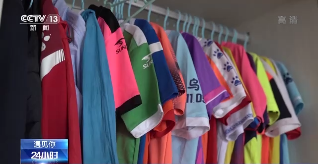 不但房间里挂满了足球比赛的奖状,陈嘉驿的衣柜里也净是球服,平时他也总是喜欢穿着球衣出门。