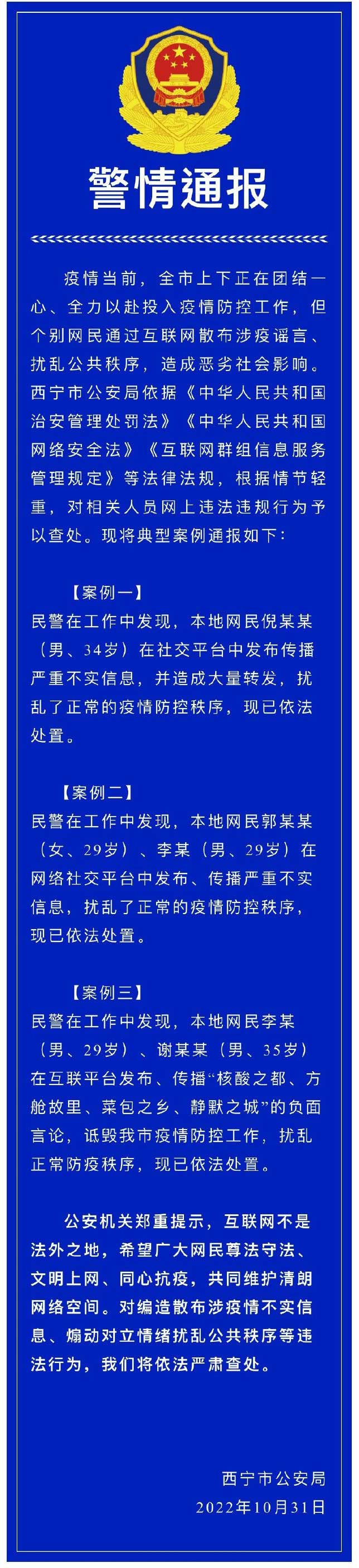 “夏都西宁”(中共西宁市委宣传部)10月31日发布警情通报称,疫情当前,个别网民通过互联网散布涉疫谣言、扰乱公共秩序,造成恶劣社会影响。西宁市公安局依据《中华人民共和国治安管理处罚法》《中华人民共和国网络安全法》《互联网群组信息服务管理规定》等法律法规,对相关人员网上违法违规行为予以查处。