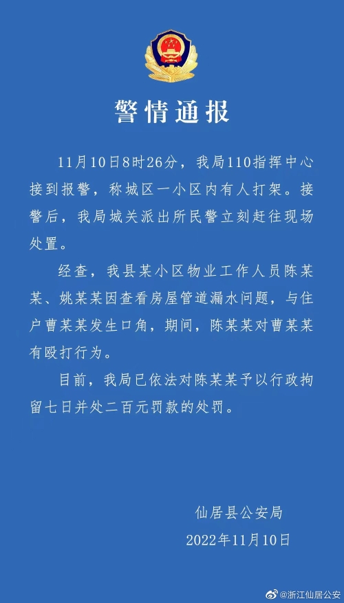 女子与物业起冲突被殴打?浙江仙居警方通报