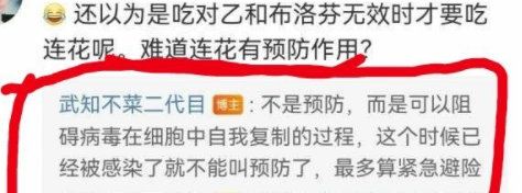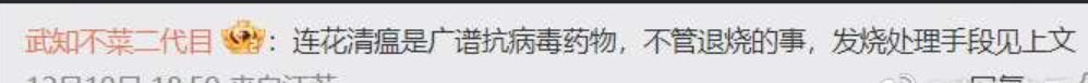 又比如,有网民发现,他在评价连花清瘟这种药物时,还发表过这种药物无法退烧,但可以“抗病毒”,还可以 “阻碍病毒在细胞中自我复制”等言论……