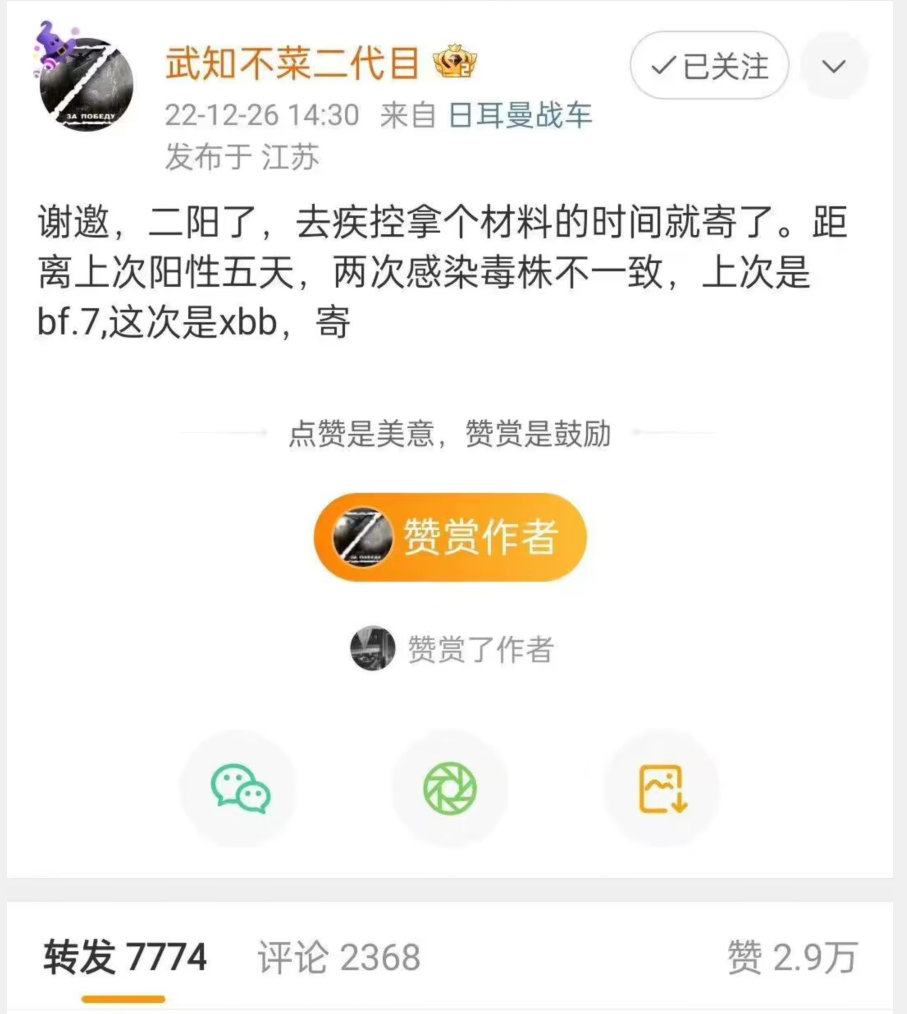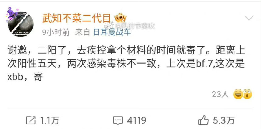 所以,事情到这里已经很清楚了:@武知不菜二代目编造了一个虚假的身份,并用这个假身份编造了一个虚假的自己在5天内先后感染BF.7和XBB毒株的故事,不仅严重误导了大众,更掀起了不小的恐慌情绪。
